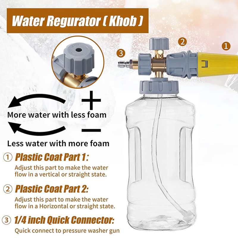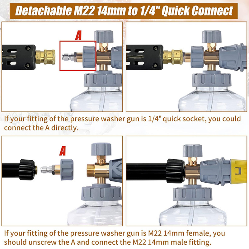 UNIVERSAL-SCHNELLVERBINDUNG - Diese Schaumpistole ist mit einer standardmäßigen 1/4"-Schnellverbindung und einem mitgelieferten M22-14 mm-Adapter ausgestattet, wodurch sie sich problemlos an eine Vielzahl von Hochdruckreinigerpistolen anschließen lässt und eine sichere und leckagefreie Verbindung gewährleistet.