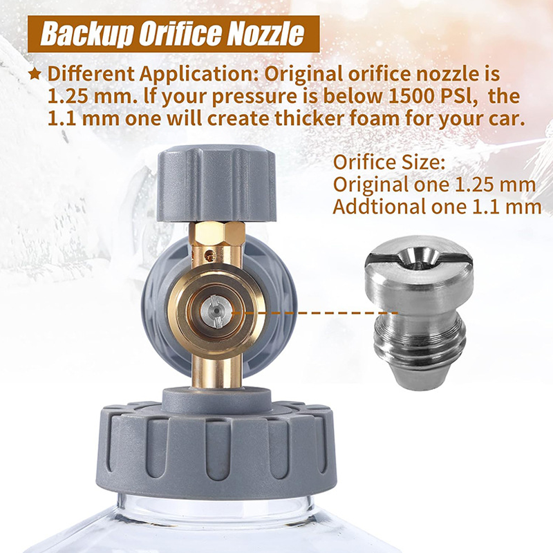 DOPPELDÜSEN – Eine 1,25-mm-Düse ist vorinstalliert, zusätzlich gibt es eine 1,1-mm-Düse. So können Sie die Schaumbildung optimal an Ihren Hochdruckreiniger anpassen und selbst bei Geräten mit niedrigerem Druck (PSI) maximale Schaumdicke erzielen.