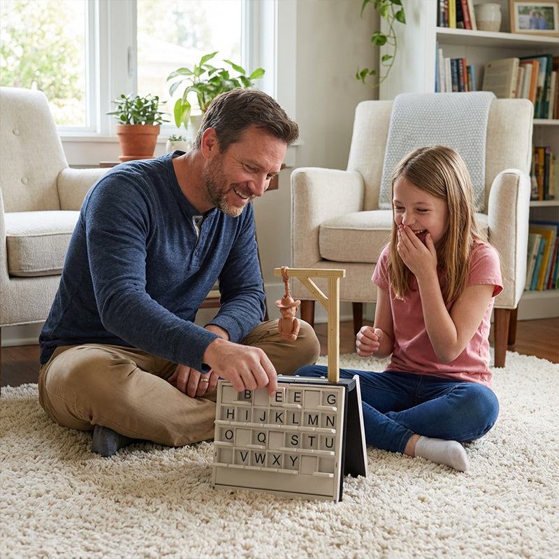 3D-TATILERLEBNIS – Erleben Sie das klassische Wortratespiel wie nie zuvor. Diese Version ersetzt Stift und Papier durch physische Buchstabenplättchen und Körperteile, wodurch jeder Rateversuch für alle Spieler spannender und interaktiver wird.