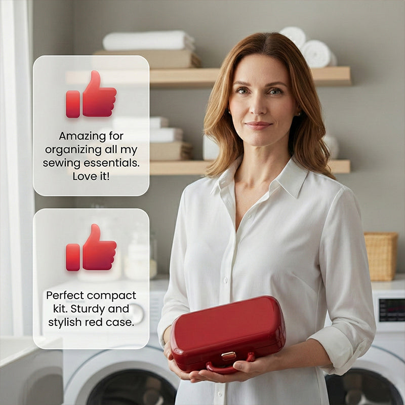 Ausgestattet mit allen notwendigen Werkzeugen für tägliche Reparaturaufgaben. Es ist eine vollständige, sofort einsatzbereite Lösung für schnelle Fixes – von der Befestigung loser Knöpfe bis zur Reparatur kleiner Stoffrisse.